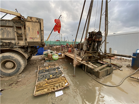 3月6日,臨時(shí)棧橋正式通車,勘察團(tuán)隊(duì)與眾多施工隊(duì)伍一同入場(chǎng),并在當(dāng)天晚上就提供了現(xiàn)場(chǎng)施工緊急需要的地質(zhì)柱狀圖及剖面圖。由于現(xiàn)場(chǎng)參建單位眾多,作業(yè)面有限,工人們只能開(kāi)展交叉作業(yè),在泥土松軟的場(chǎng)地上不斷搬動(dòng)鉆機(jī),調(diào)整作業(yè)地點(diǎn)。